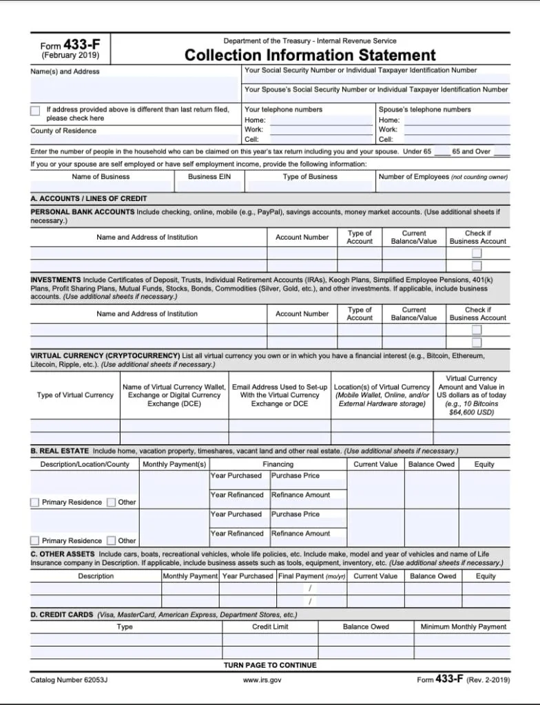 The form used in this process is called Form 433-F (Collection Information Statement). This document collects financial information about you and helps the IRS determine eligibility for these programs based on your household income, living expenses, real estate owned, credit card balances, and bank accounts among other factors.